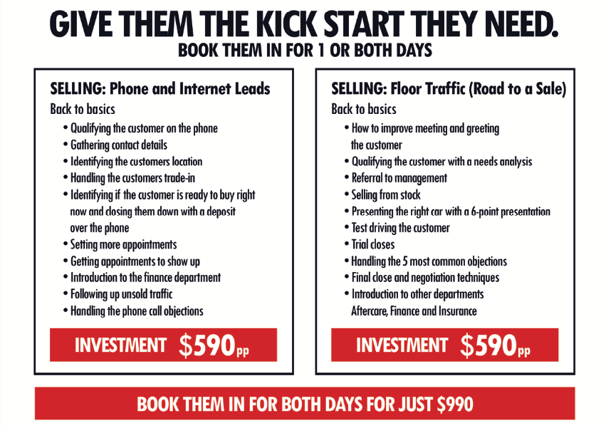 My sales training programs are designed to minimise leakage, with better word tracks and qualification techniques it leads the sales person towards a better presention of the vehicle based on the customers wants and needs. Adding commitment and negotiation techniques creates more sales.